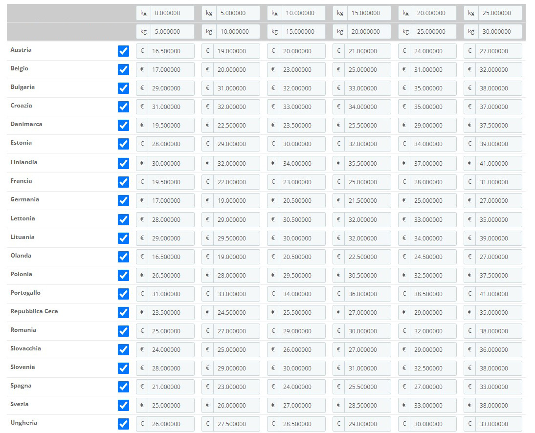 Shipping costs vary according to the total weight, below the shipping costs table throughout the European community.